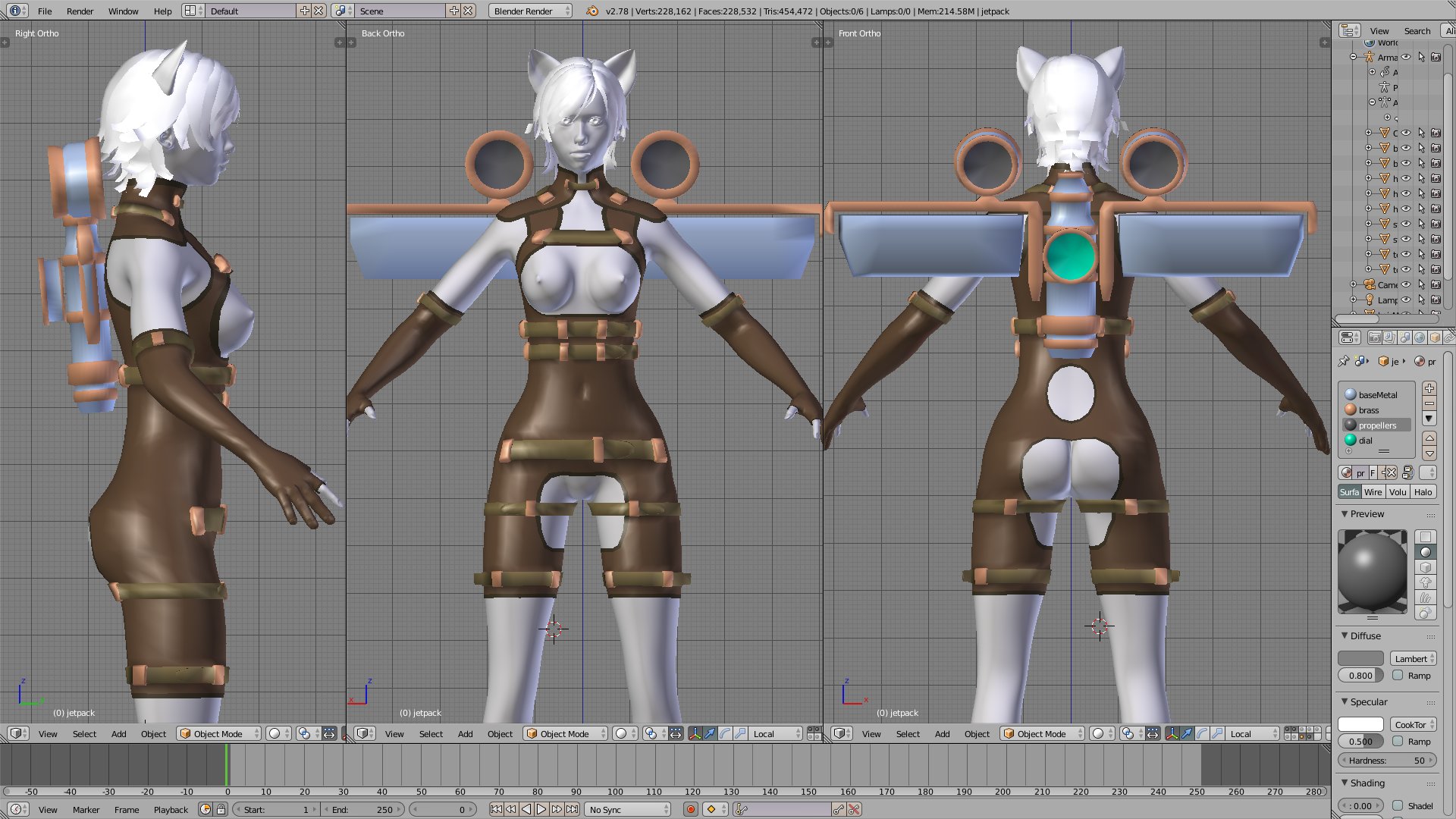 So next up ... I need said model with cat ears slapping into a harness which would ultimately be attached to some sort of steampunk propeller pack. Cue searching for tutorial videos on all the other changes to Blender3D's modifiers. One of these I have already found out by testing - is that the decimate modifier, which turns your overly high poly mesh into something more video game and Level Of Detail (LOD) distance friendly, now keeps the weight painting data for bones in the armature. Ye olde 2.44 version used to just kill the vertex information, leaving you with an unanimatable (that's not a word is it?) model, so I used to have to do my LODs for Airship Dragoon by hand/eye manually ... which was a real pain in the Shizener. So this improvement was another major reason to finally upgrade to a newer version of Blender3D.