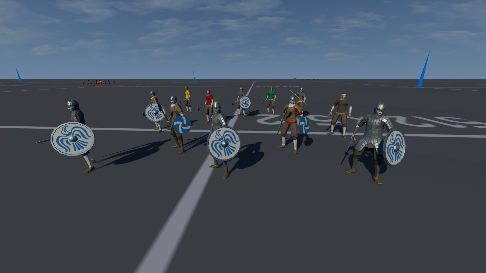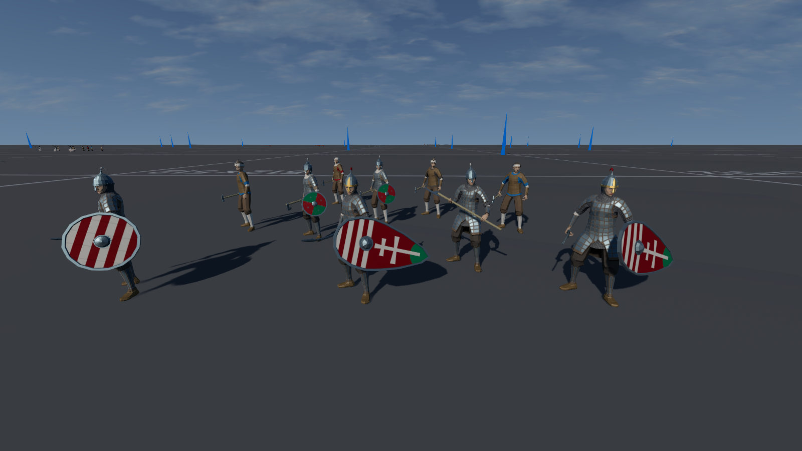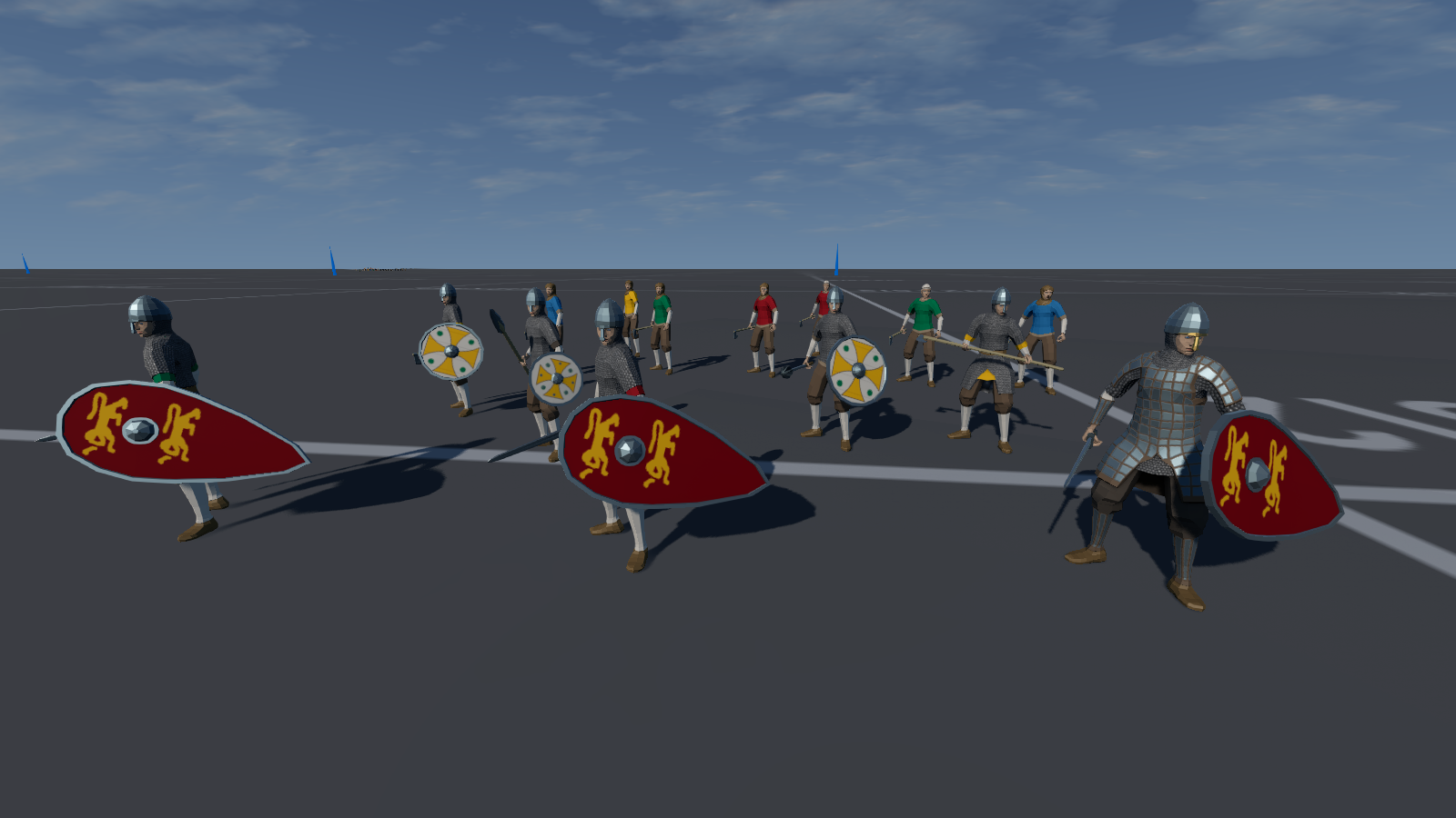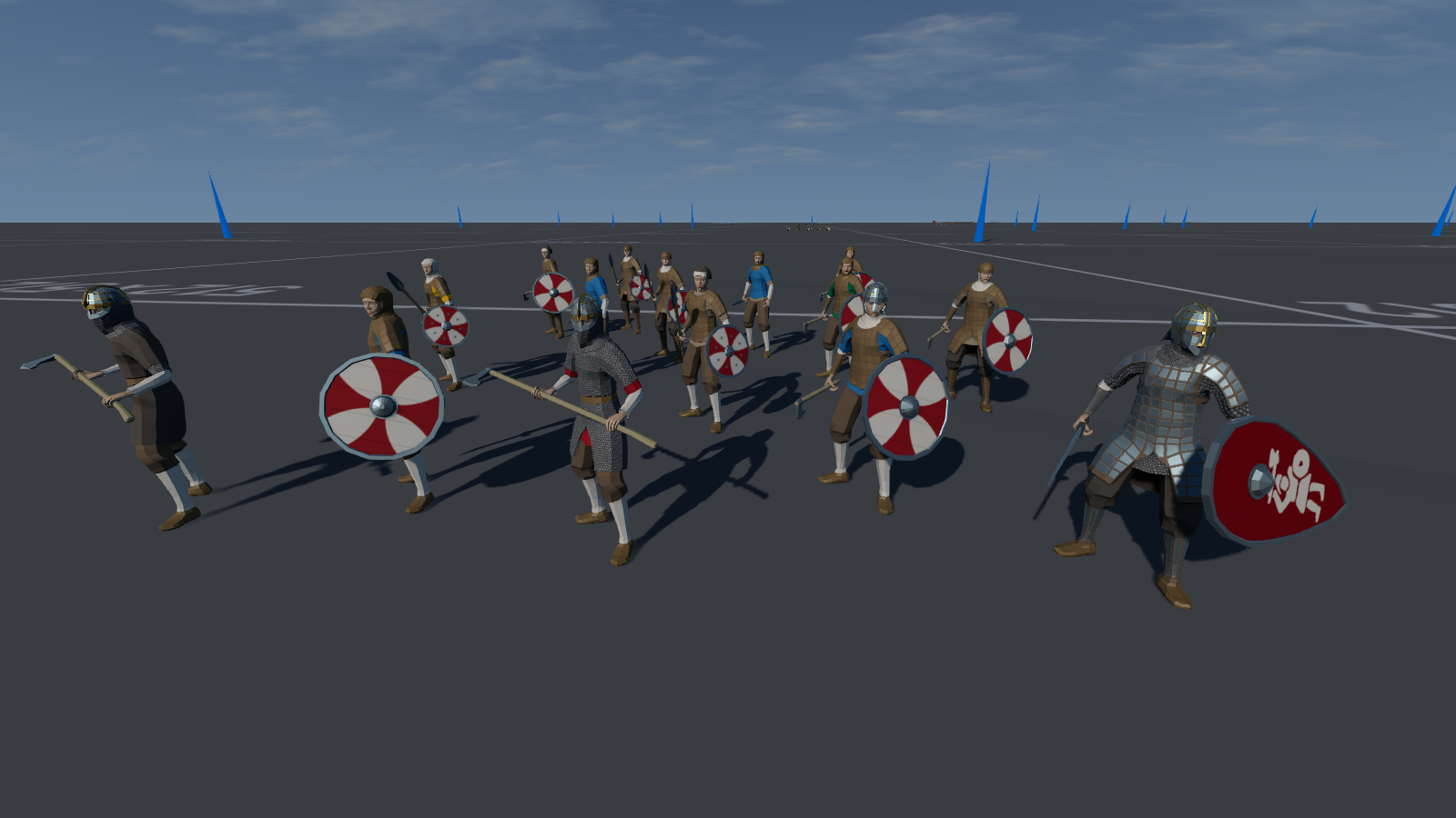 With all the warbands now equipped - at least except for bows as I haven't out the code needed for archery just yet, but it is coming - I needed to bring home the awesomeness of hitting someone with a poleaxe. For this I hunted around for some of the old death animations which I had got for Airship Dragoon and modified them for the new rigging system which my current models use.
