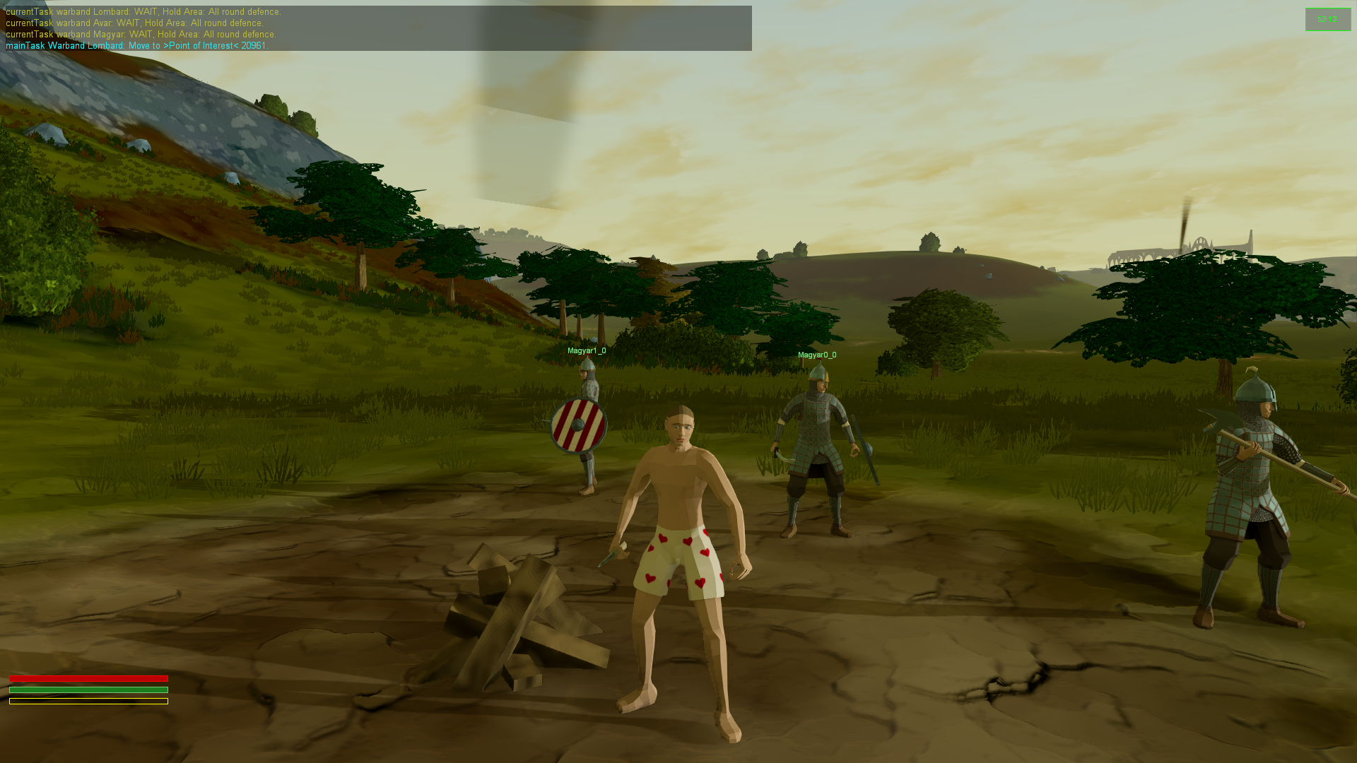I had a play around with the ScatterSky and TimeOfDay objects, and after some faffing in the code, decided the easiest way - at least in network overhead - to get really red dusks and dawns, was to use the built in TimeOfDay callback with a little custom C++ to change to change the rayleigh scattering and ambient colour. This callback also allows for the campfires to light up on sunset and extinguish at dawn, giving more markers as to places the warbands are likely to head. View distance for the warbands changes according to the time of day, and leads to some rather nasty surprise battles during the hours of darkness, when bands or burley warriors bump into each other in the pitch black.